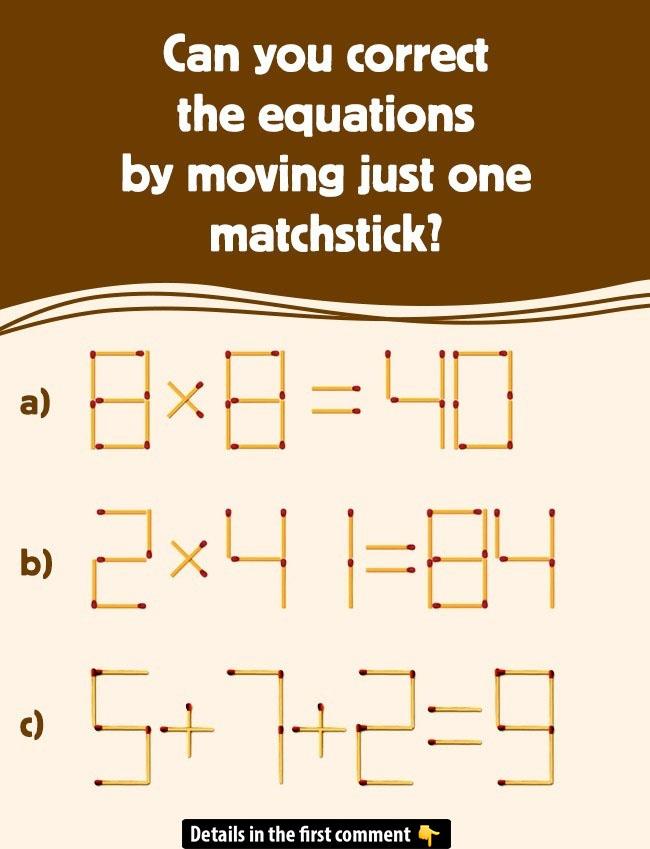 How did you do? Were you able to figure out how to move just one matchstick to make each equation correct? Let us know in the comments below what answer you came up with, and feel free to challenge your friends with this puzzle too!