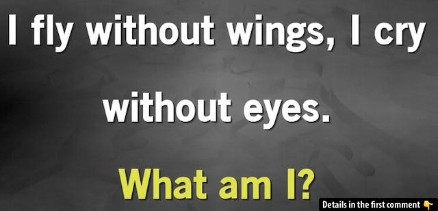 When solving a riddle like this, many people tend to focus on the first part, “I fly without wings”, thinking it must refer to something like a bird or an insect. However, that’s a trick! The second part, “I cry without eyes”, also confuses many. It makes people think of something that should logically have eyes to cry, causing them to miss the right answer entirely.